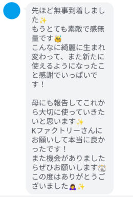 リメイクが完成し、お届けした後に、お客様から嬉しいメッセージをいただきましたのでご紹介いたします。