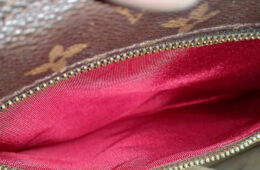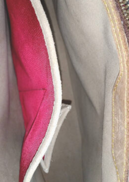 ルコは持ち手の交換に加えて、ベース部分と内ポケットの合皮を赤のシャンタン生地へリメイク。